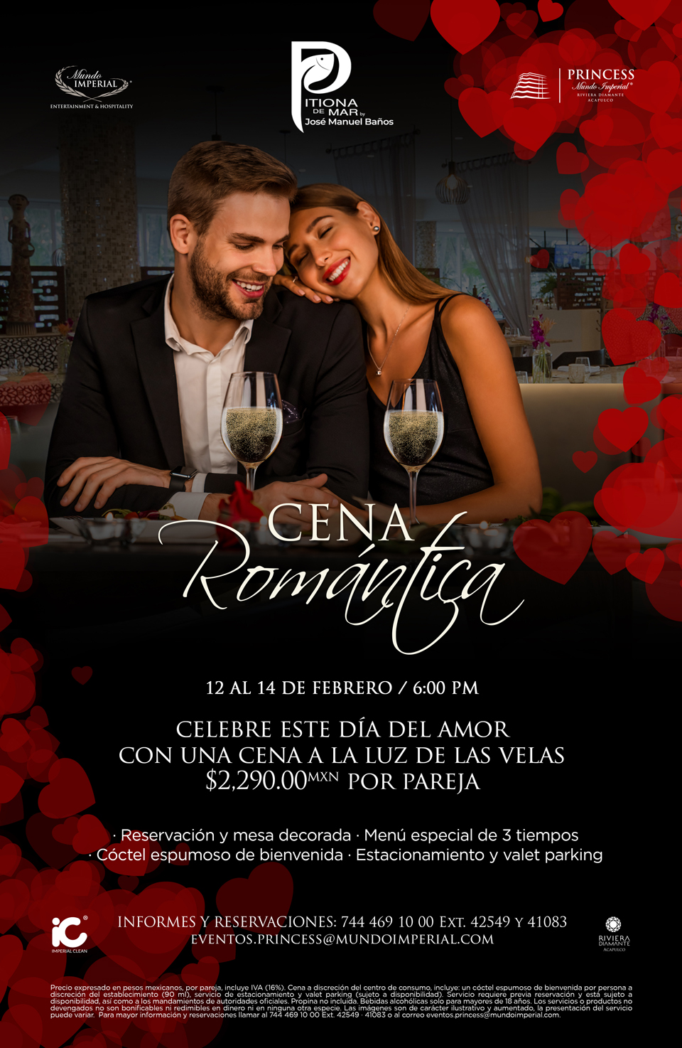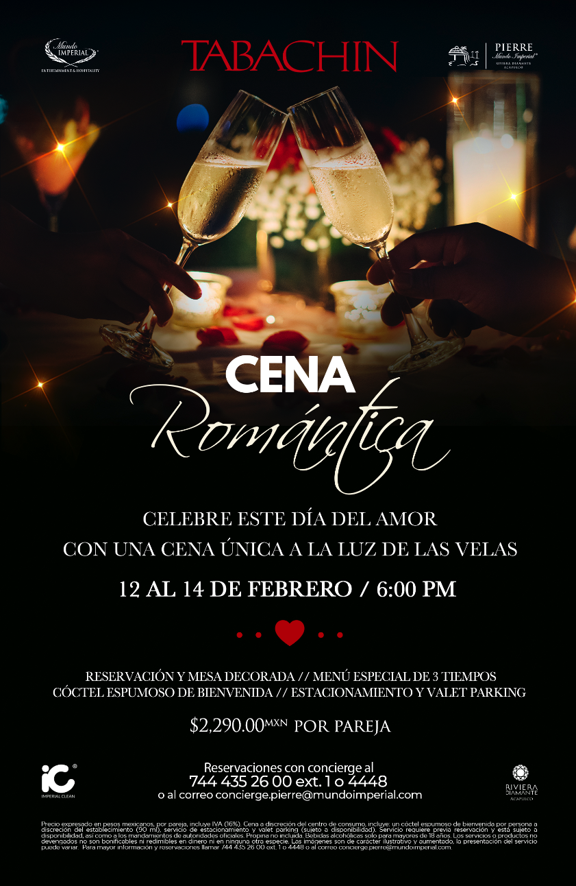 Por este motivo, los restaurantes Pitiona de Mar, con los mejores sabores de Oaxaca y Tavola, especializado en la cocina italiana, ubicados al interior del hotel Princess Mundo Imperial, así como el reconocido restaurante Tabachin de Pierre Mundo Imperial, ofrecerán una deliciosa “Cena Romántica” a la luz de las velas del 12 al 14 de febrero a partir de las 06:00 pm con un costo de $2,290.00 pesos por pareja, las cuales constarán de: