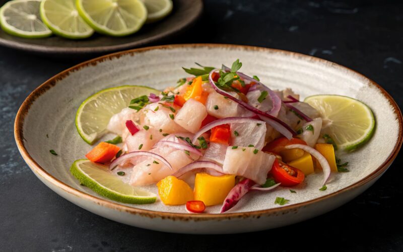 Reconocido mundialmente como el referente clásico, el ceviche peruano se caracteriza por su sencillez y precisión. La base son pescados blancos firmes —como corvina o lenguado— marinados brevemente en jugo de limón con cebolla morada, ají limo, sal y cilantro.