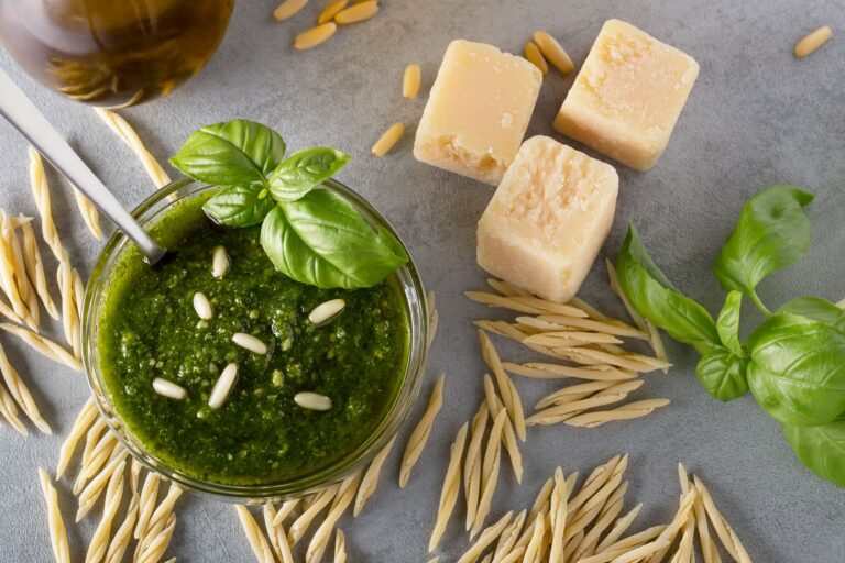El pesto genovés, elaborado con albahaca fresca, piñones, ajo, parmesano y