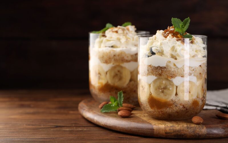 Este parfait destaca por su armonía de sabores y texturas: la base crocante de galletas trituradas, seguida de una capa de plátano fresco, crema batida o mascarpone suavemente endulzada, un toque de caramelo espeso y, por último, un topping crujiente de nuez o almendra que aporta el contraste ideal.