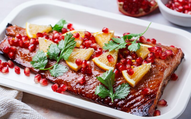 El salmón glaseado con granada y naranja es un platillo que combina técnica sencilla con alto impacto visual. La grasa natural del pescado se equilibra con la acidez cítrica y el toque ligeramente dulce y brillante de la reducción. Los arilos de granada aportan textura fresca y contraste, convirtiéndolo en una receta ideal para cenas especiales o menús contemporáneos.